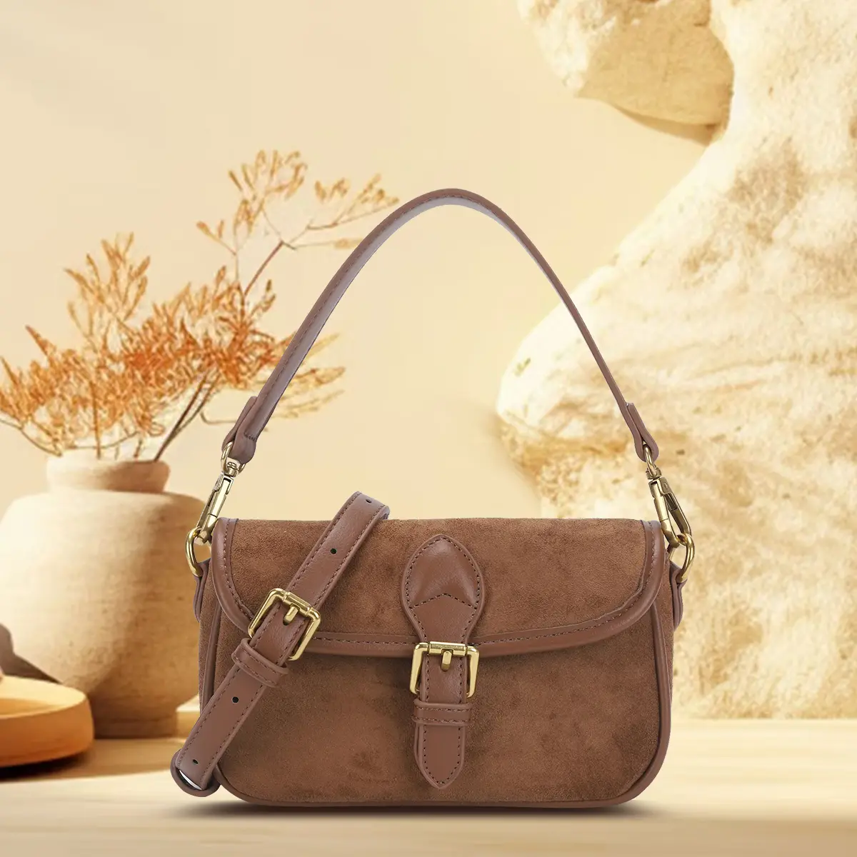 Discover the Angelkiss suede mini shoulder bag, available in Pink, Coffee, Red, and Brown.