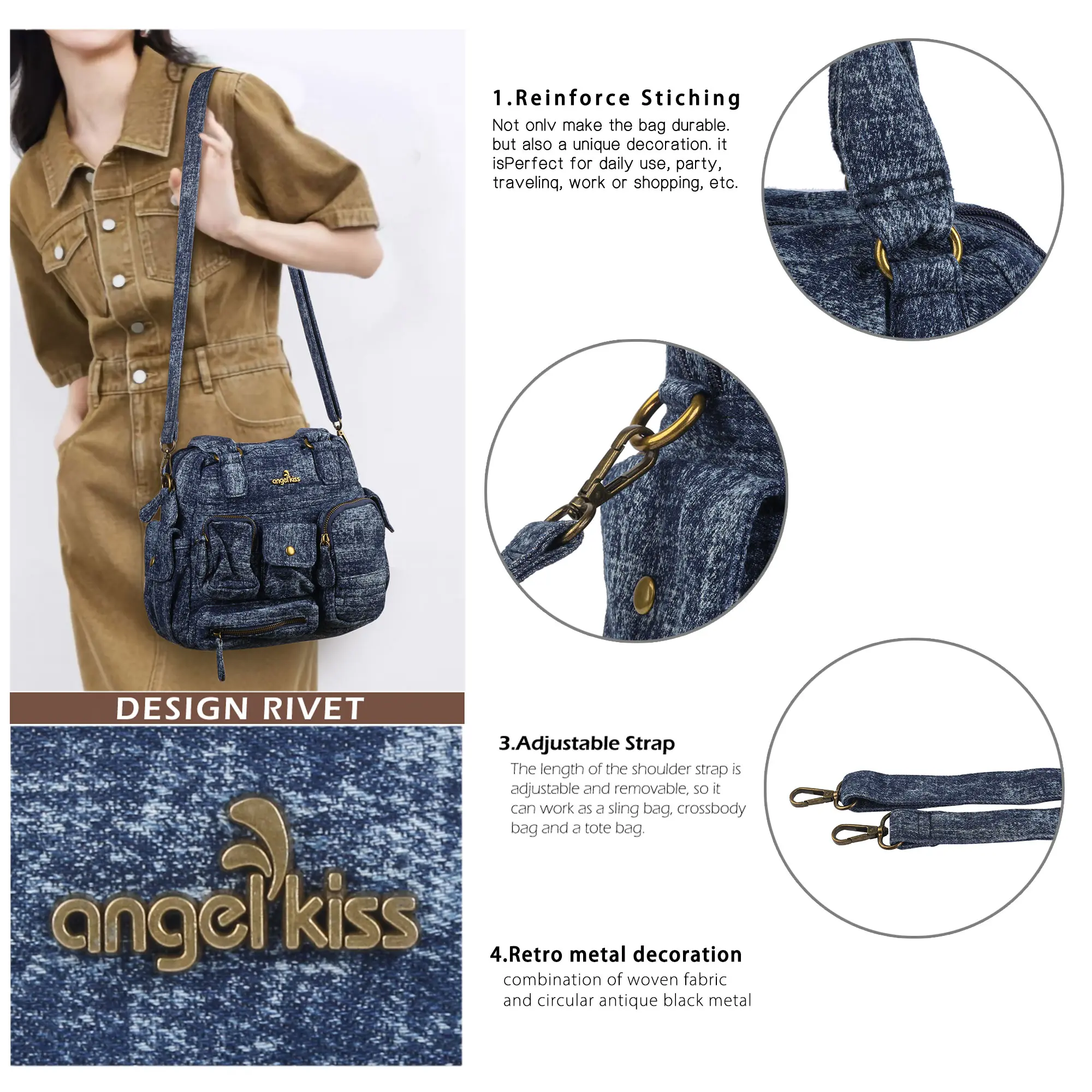 This Angelkiss denim-style shoulder bag is crafted from soft washed fabric with a classic silhouette. It offers a spacious interior and multiple functional pockets, making it a perfect all-rounder for daily errands, workdays, and casual outings. Its natural washed texture and relaxed shape create a stylish, effortless vibe.